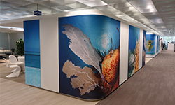 Freie Wandflächen in Räumen eignen sich in besonderem Maße zur akustischen Konditionierung. Großflächige Wandbilder nehmen jedes Bildmotiv auf, ob Firmenlogo, Grafiken oder Naturfotografie. |mehr|