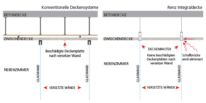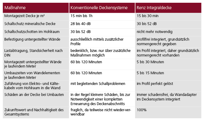Bislang basiert der Innenausbau moderner Bürolandschaften auf über zwanzig verschiedenen Einzelgewerken, welche von ebenso vielen Firmen ausgeführt werden. Dadurch entstehen zahlreiche Probleme an dementsprechenden Schnittstellen zwischen den Gewerken. Renz hat mit seiner Profildecke eine integrale Lösung geschaffen, die zwischen Decke und Wand ansetzt, die beiden Gewerke problemlos miteinander verbindet und weitere Produkte in das System mit einbindet. Dies birgt eine Reihe von Vorteilen gegenüber herkömmlichen Deckensystemen.